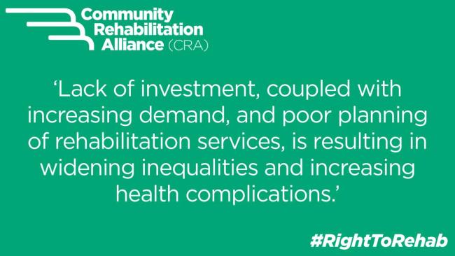 - Make a commitment to rehabilitation as an equal pillar of health care to medicines and surgery and reflect this in an updated NHS Constitution and other NHSE planning guidance Mandates.