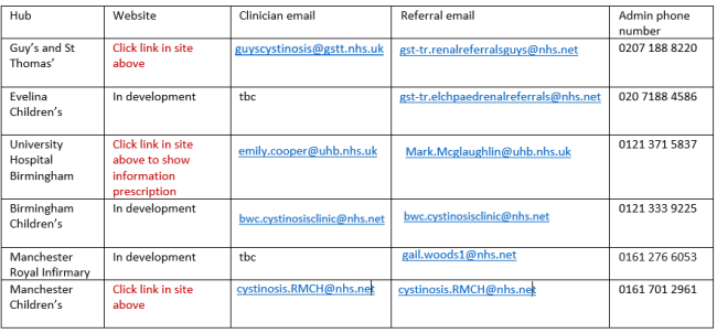 Information about Cystinosis national designation centres or “hubs” for patients in England